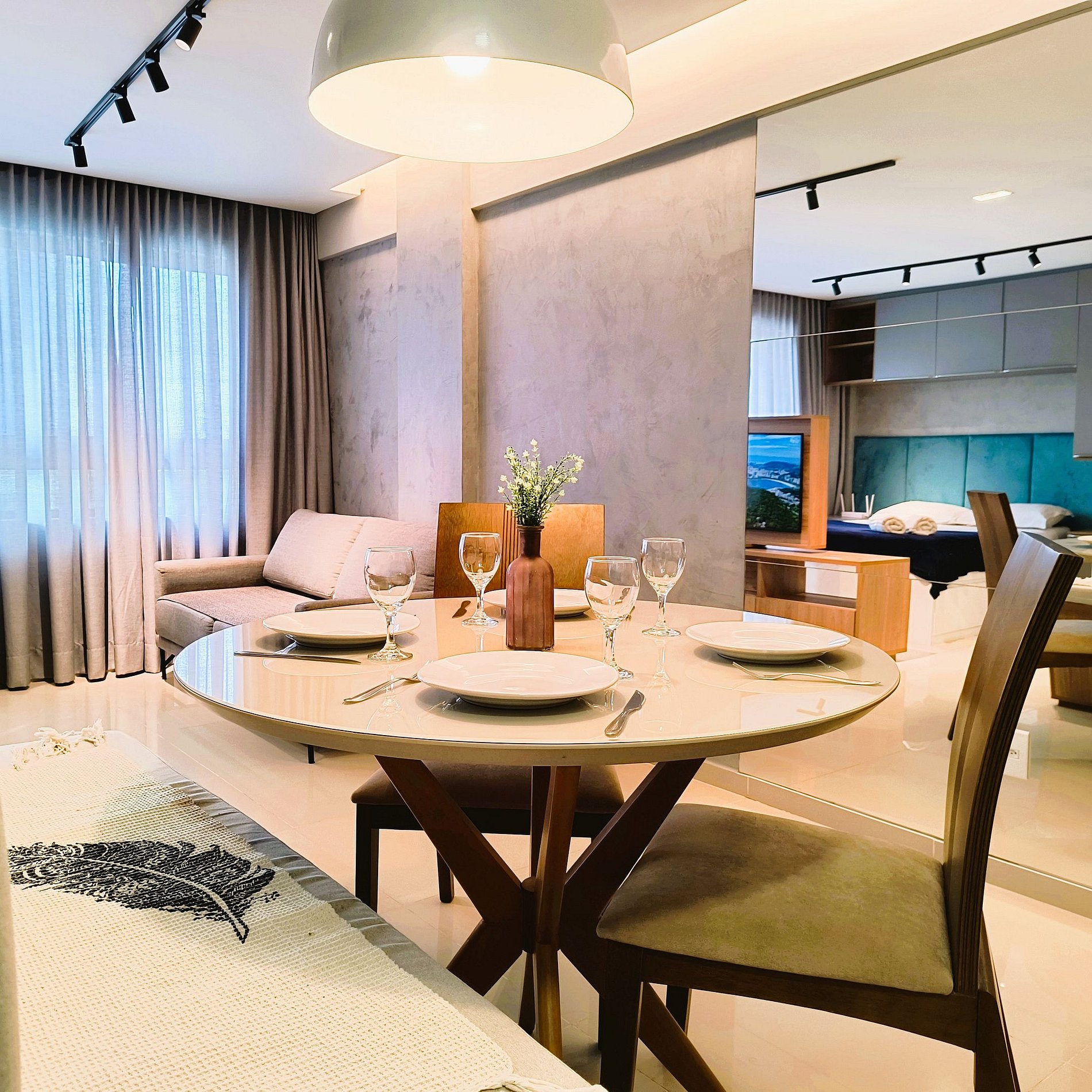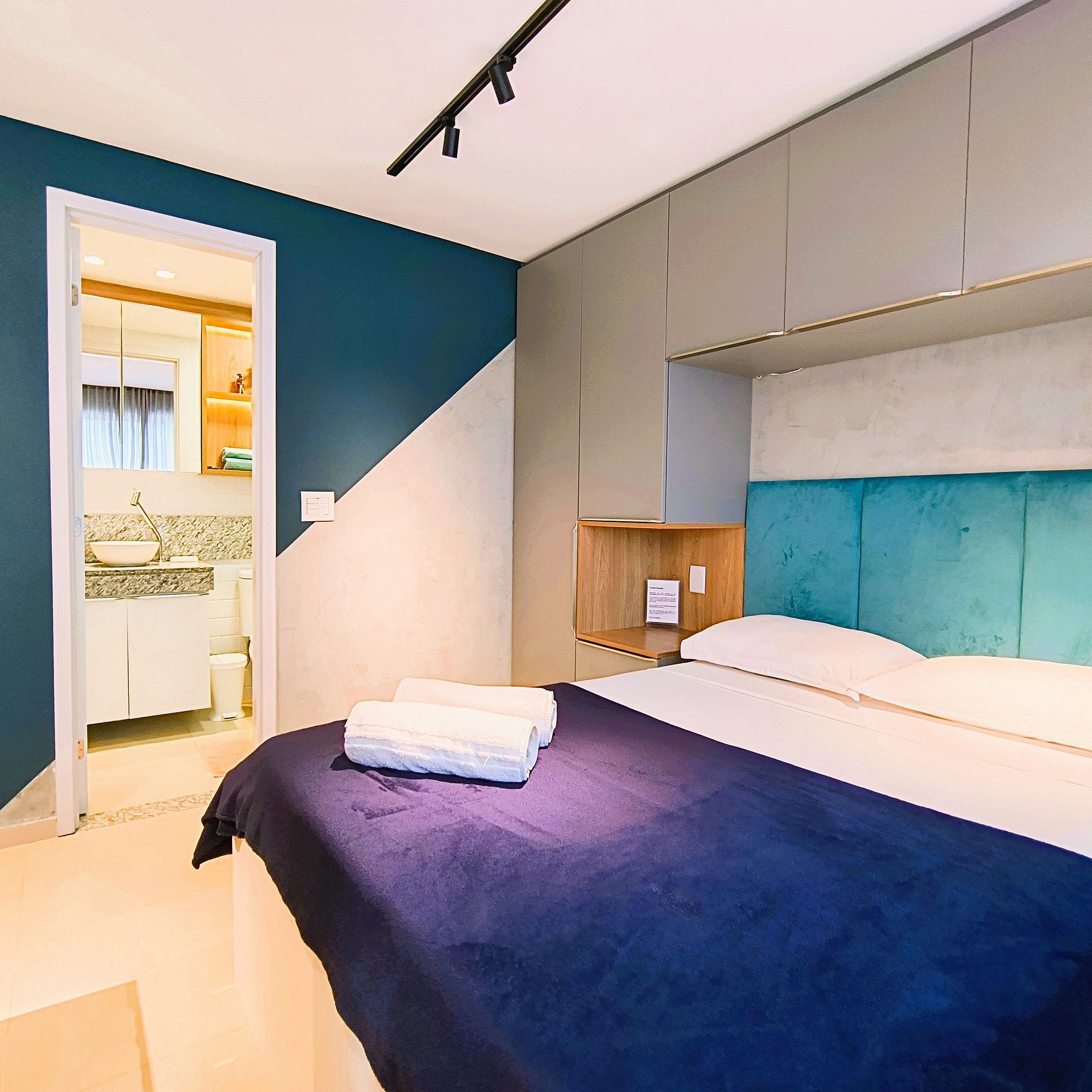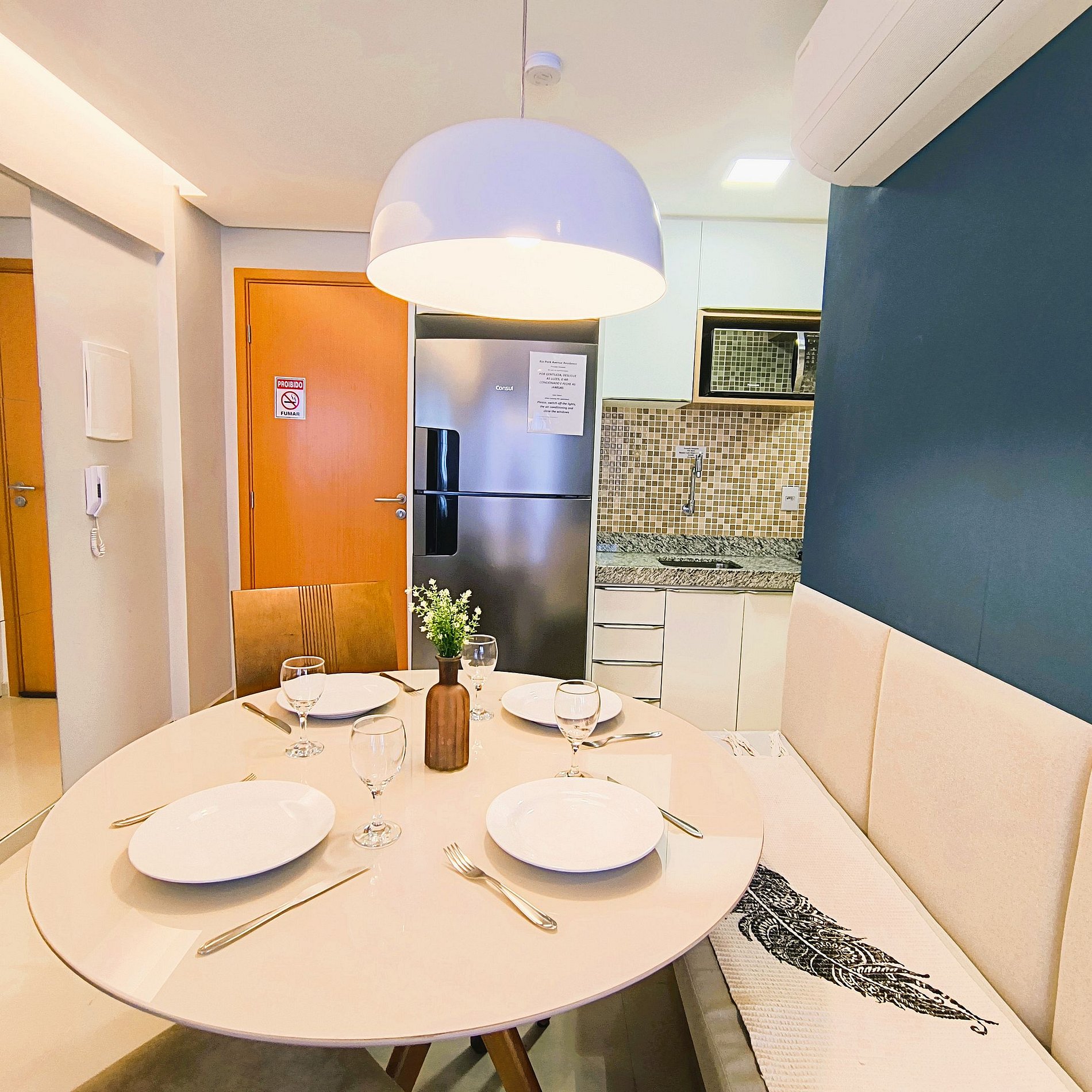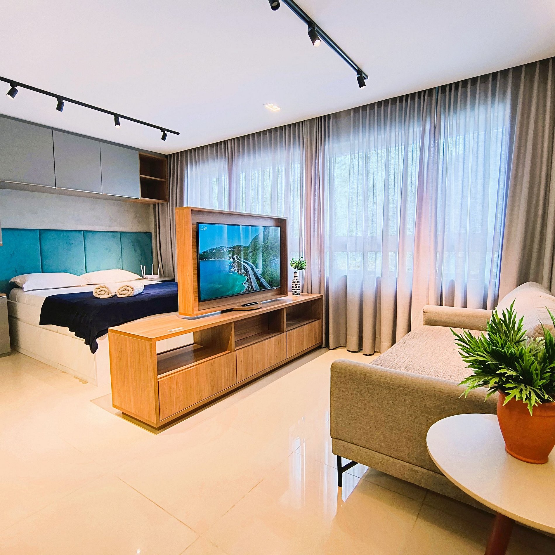 O apartamento é composto de sala e quarto open plan, banheiro e cozinha. Dispomos de um serviço de frigobar e o consumo pode ser pago no final da sua estadia. (Instruções para pagamento estarão descritas no cardápio.) TV com painel giratório para dois ambientes. O prédio possui uma ótima piscina com vista para o mar, uma pequena academia e uma sala de reuniões.