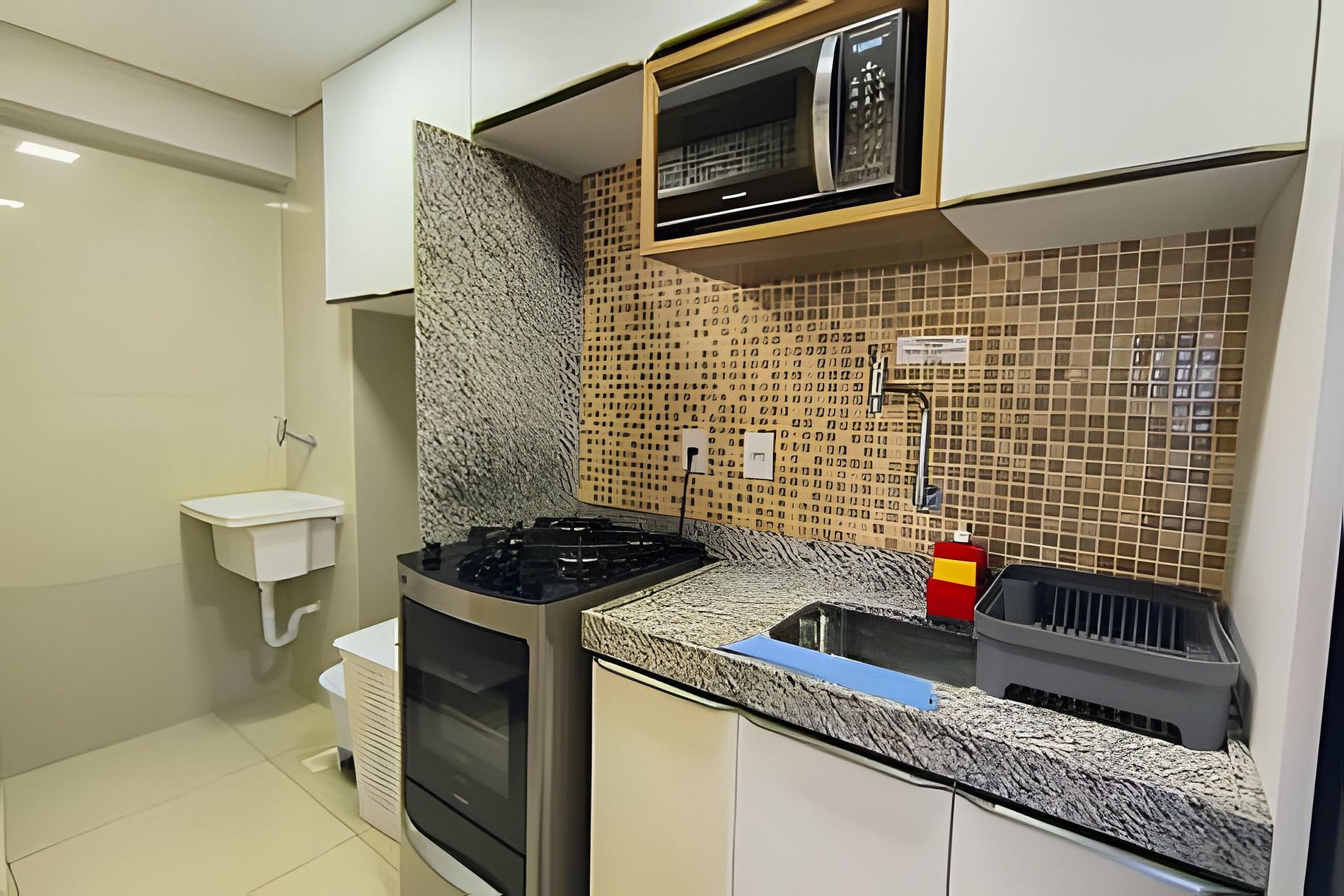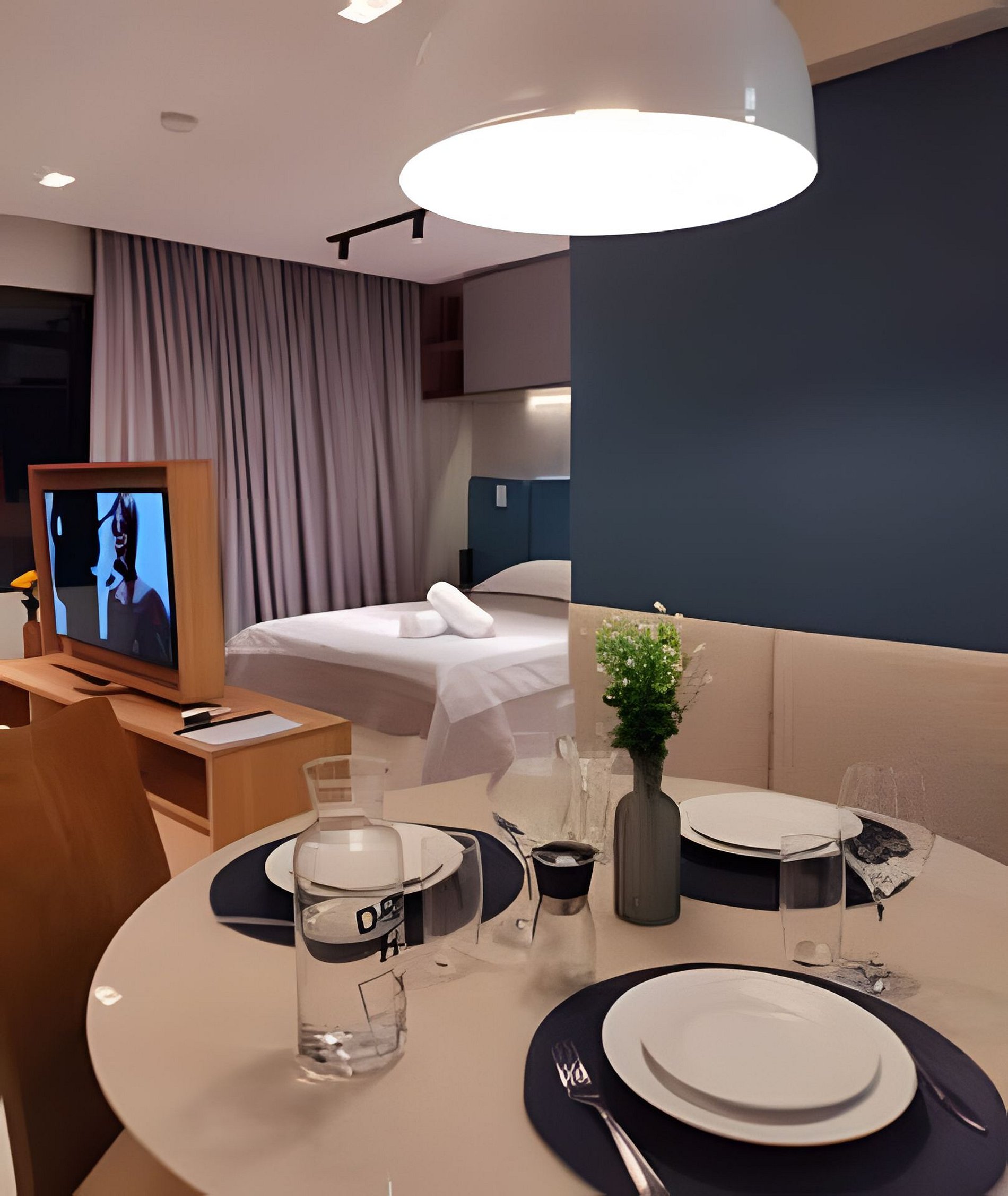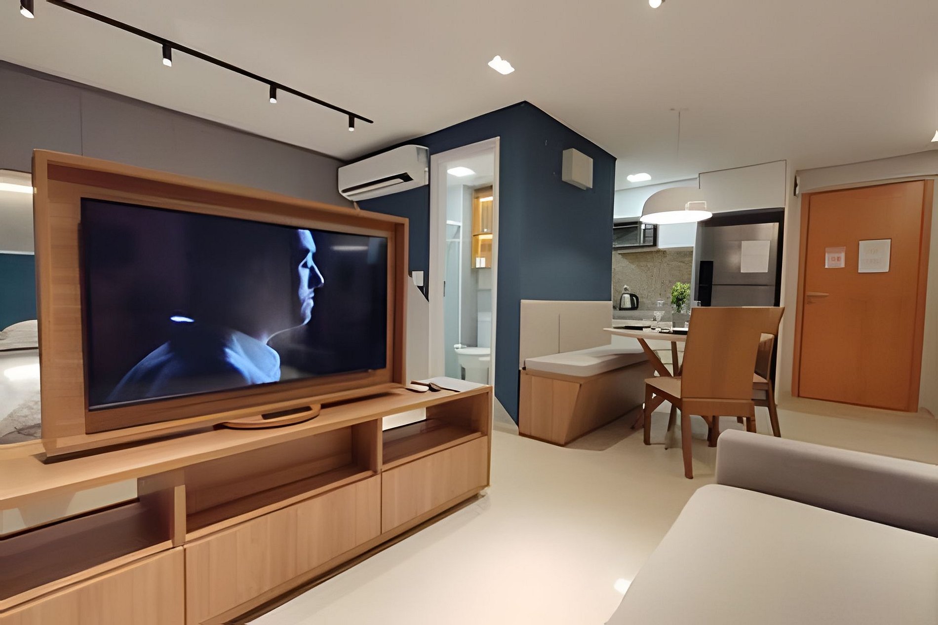 O apartamento é composto de sala e quarto open plan, banheiro e cozinha. Dispomos de um serviço de frigobar e o consumo pode ser pago no final da sua estadia. (Instruções para pagamento estarão descritas no cardápio.) TV com painel giratório para dois ambientes. O prédio possui uma ótima piscina com vista para o mar, uma pequena academia e uma sala de reuniões.