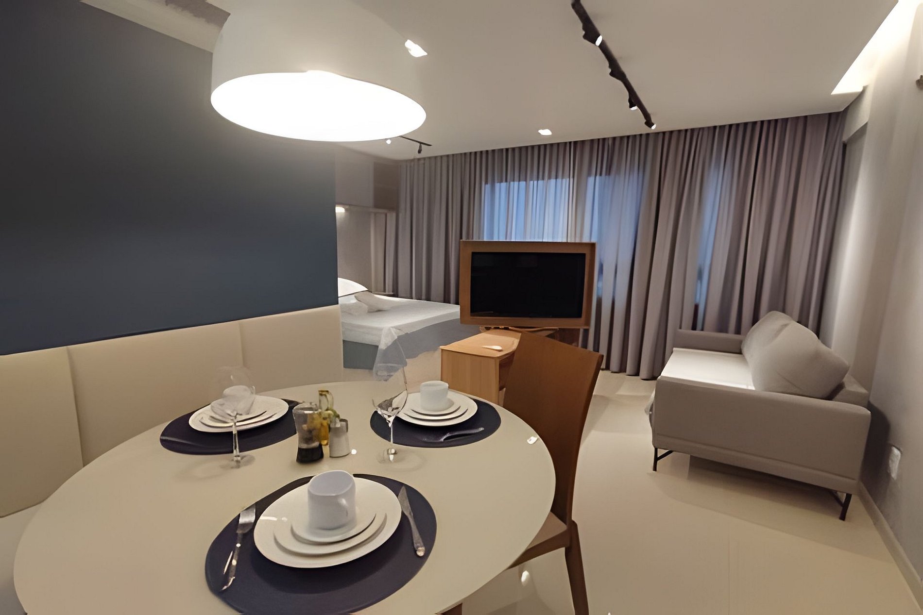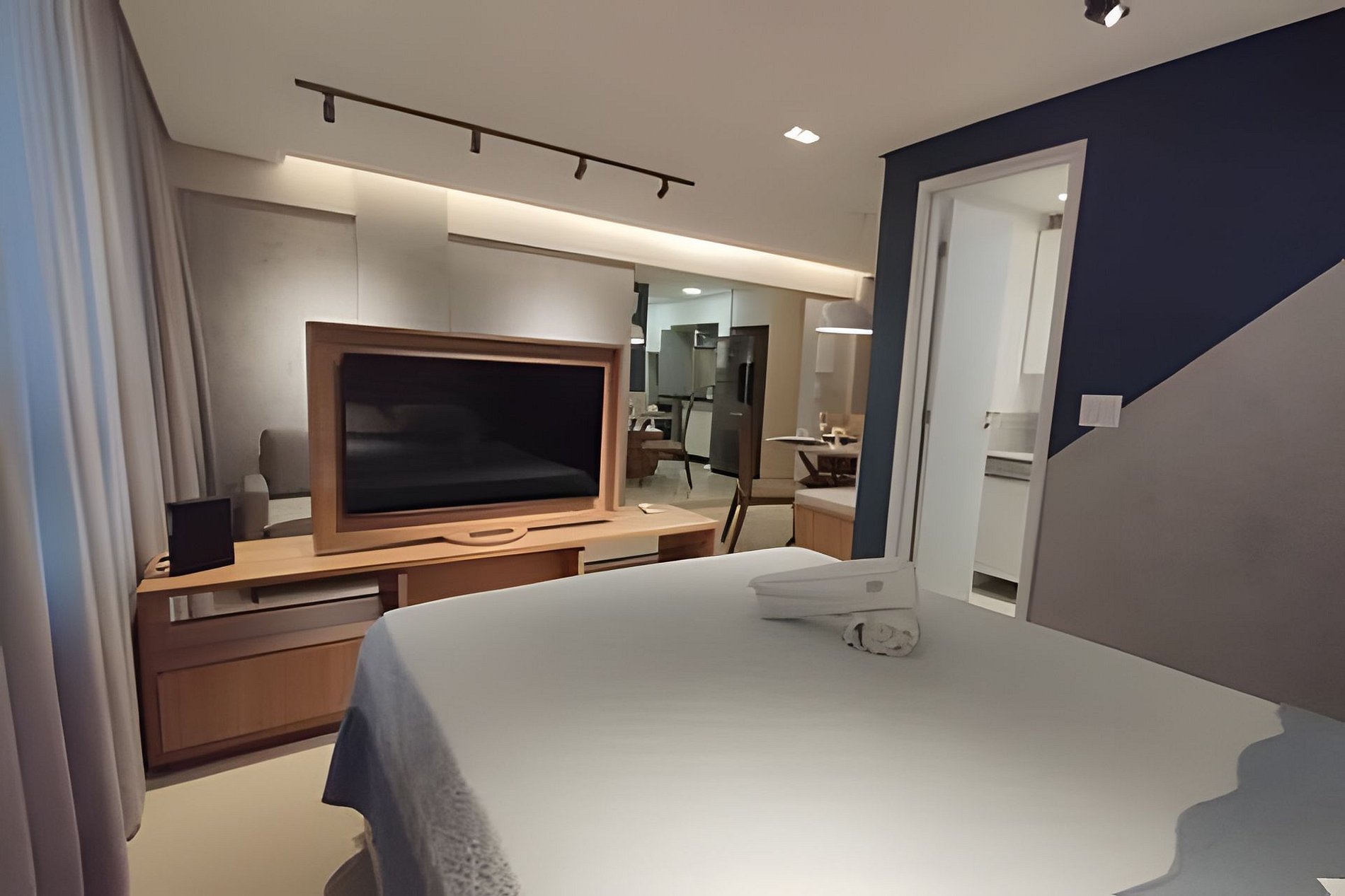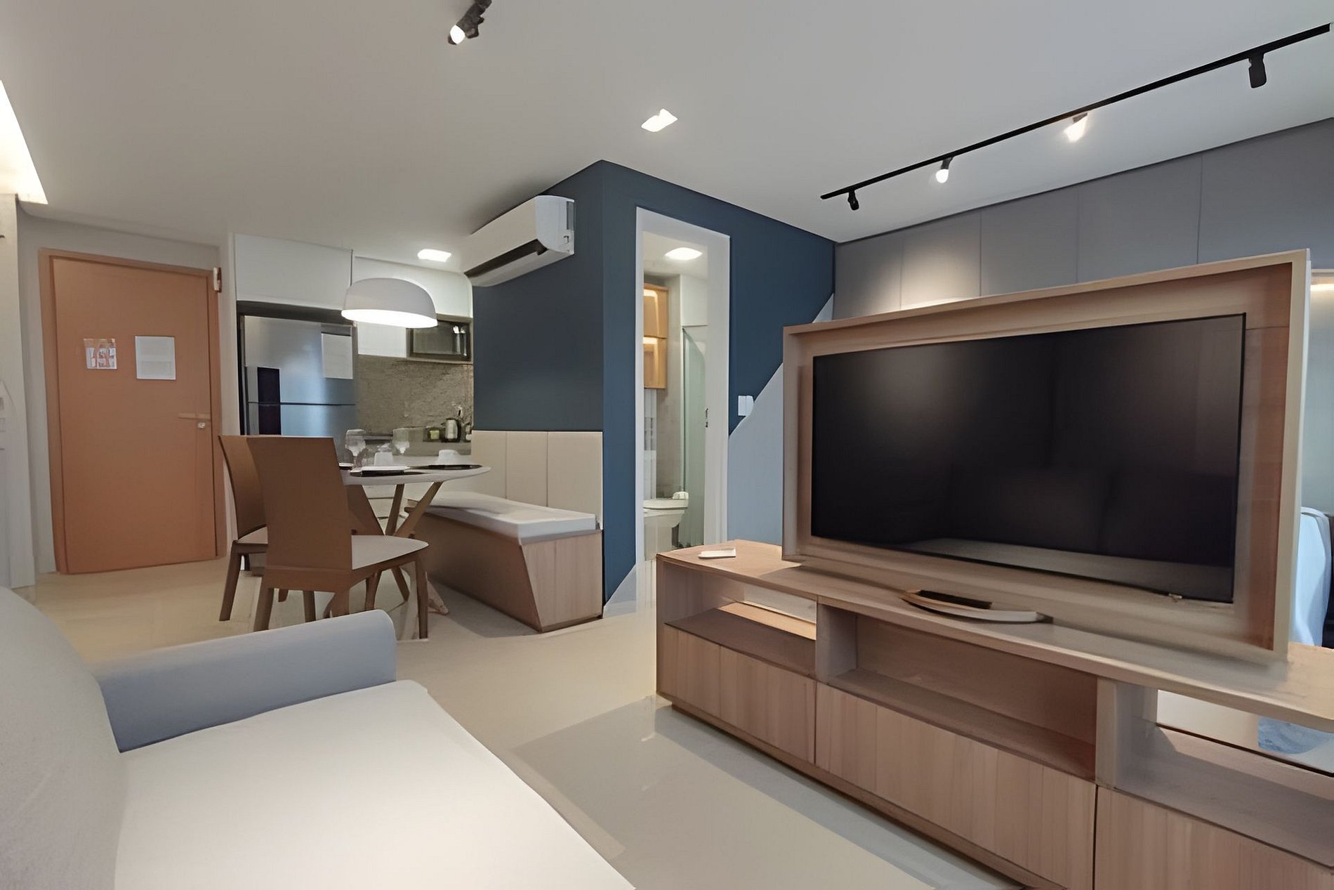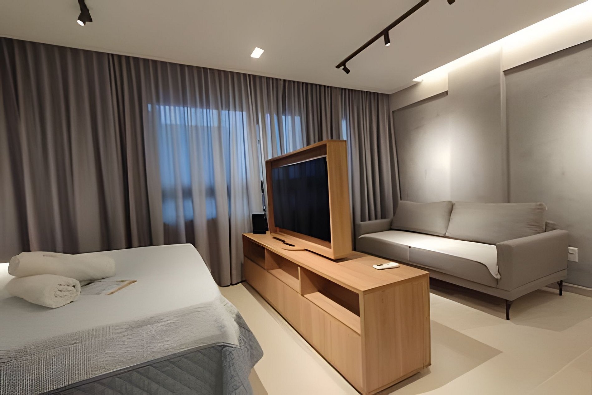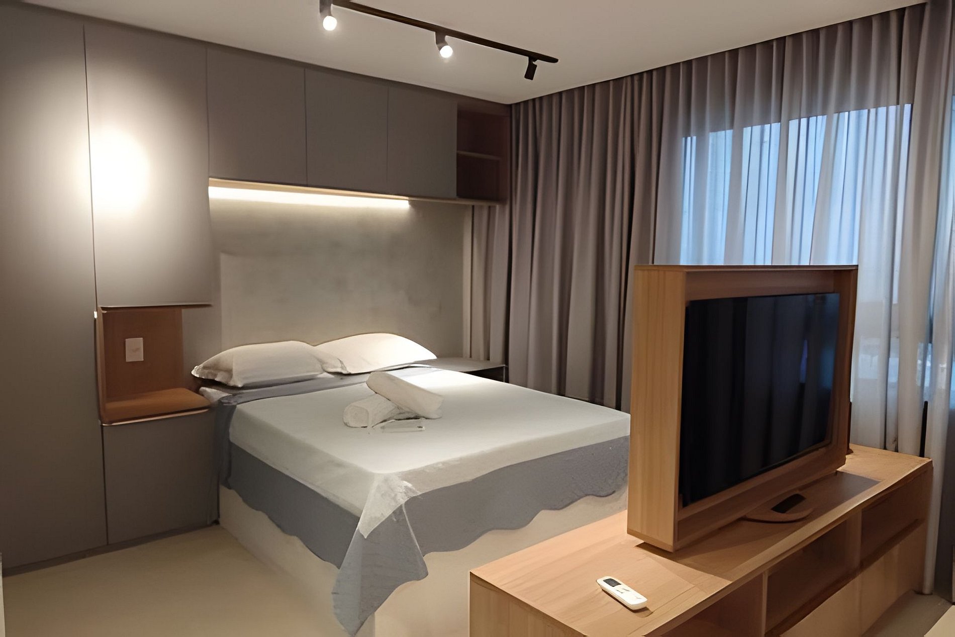 O apartamento é composto de sala e quarto open plan, banheiro e cozinha. Você também terá uma TV com painel giratório para dois ambientes. O prédio possui uma ótima piscina com vista para o mar, uma pequena academia e uma sala de reuniões.