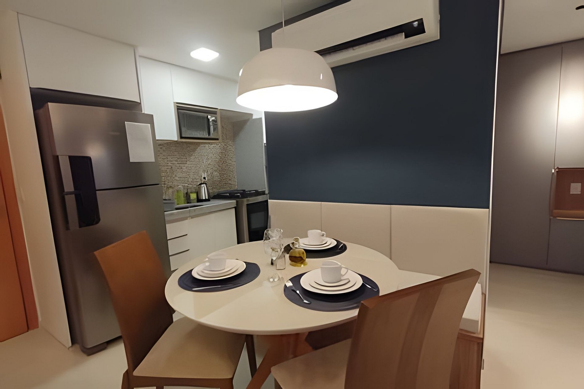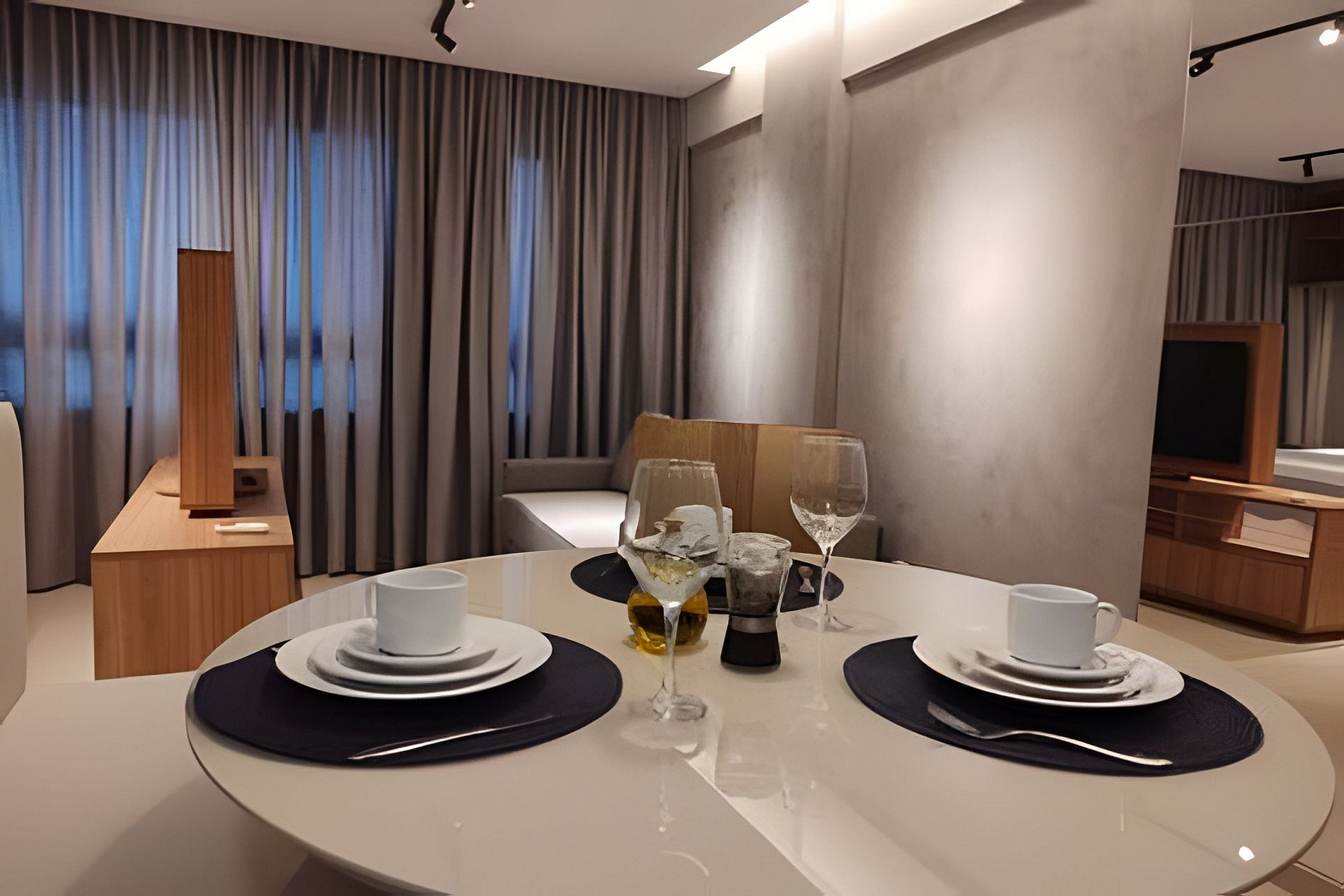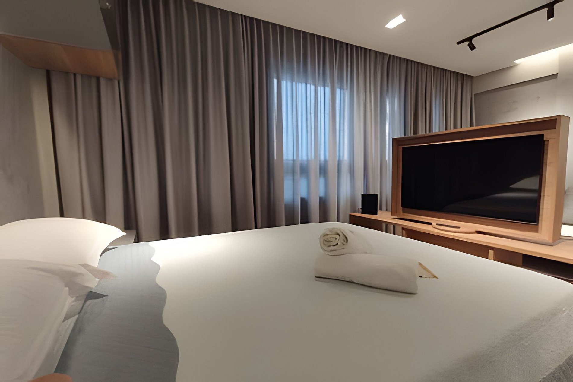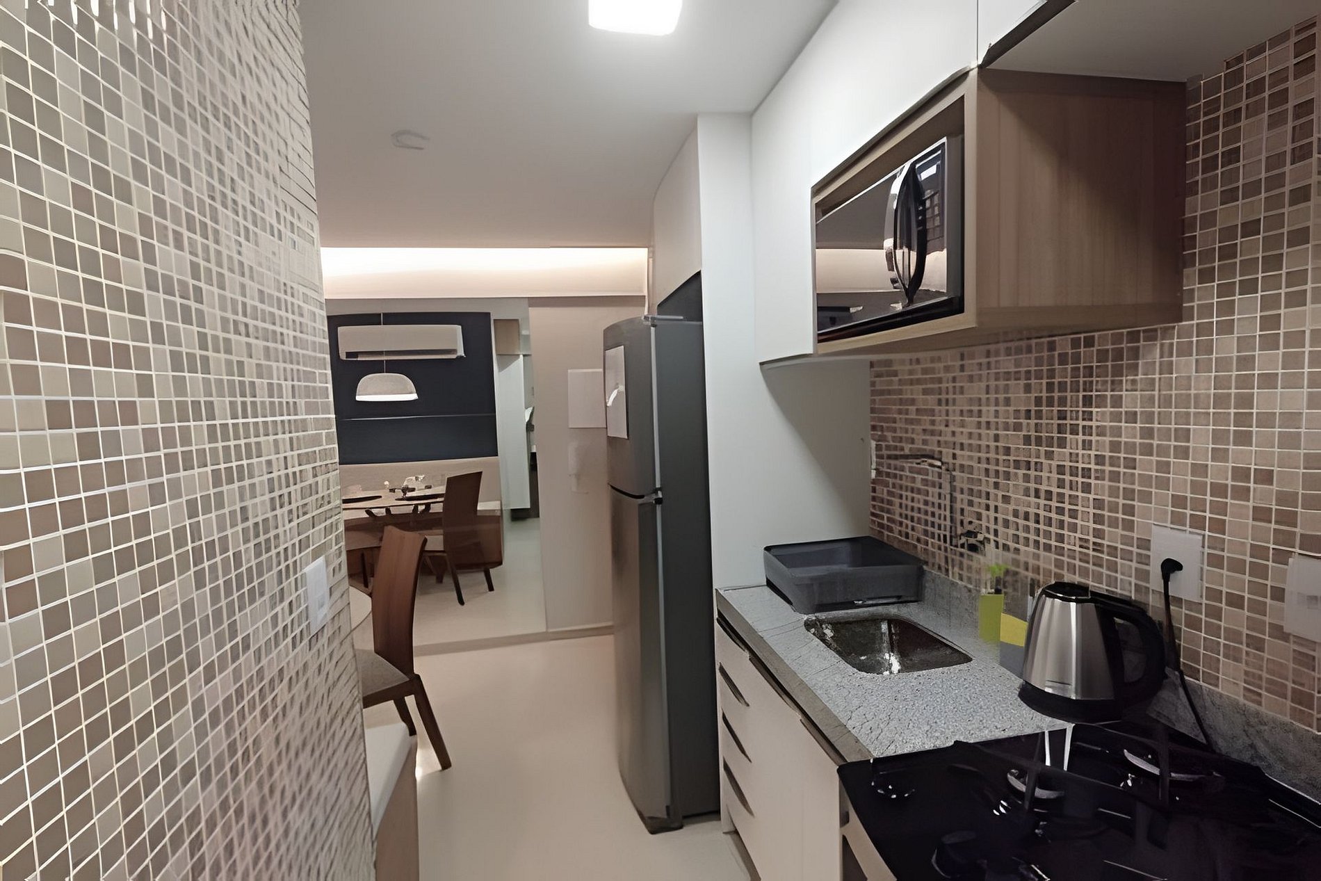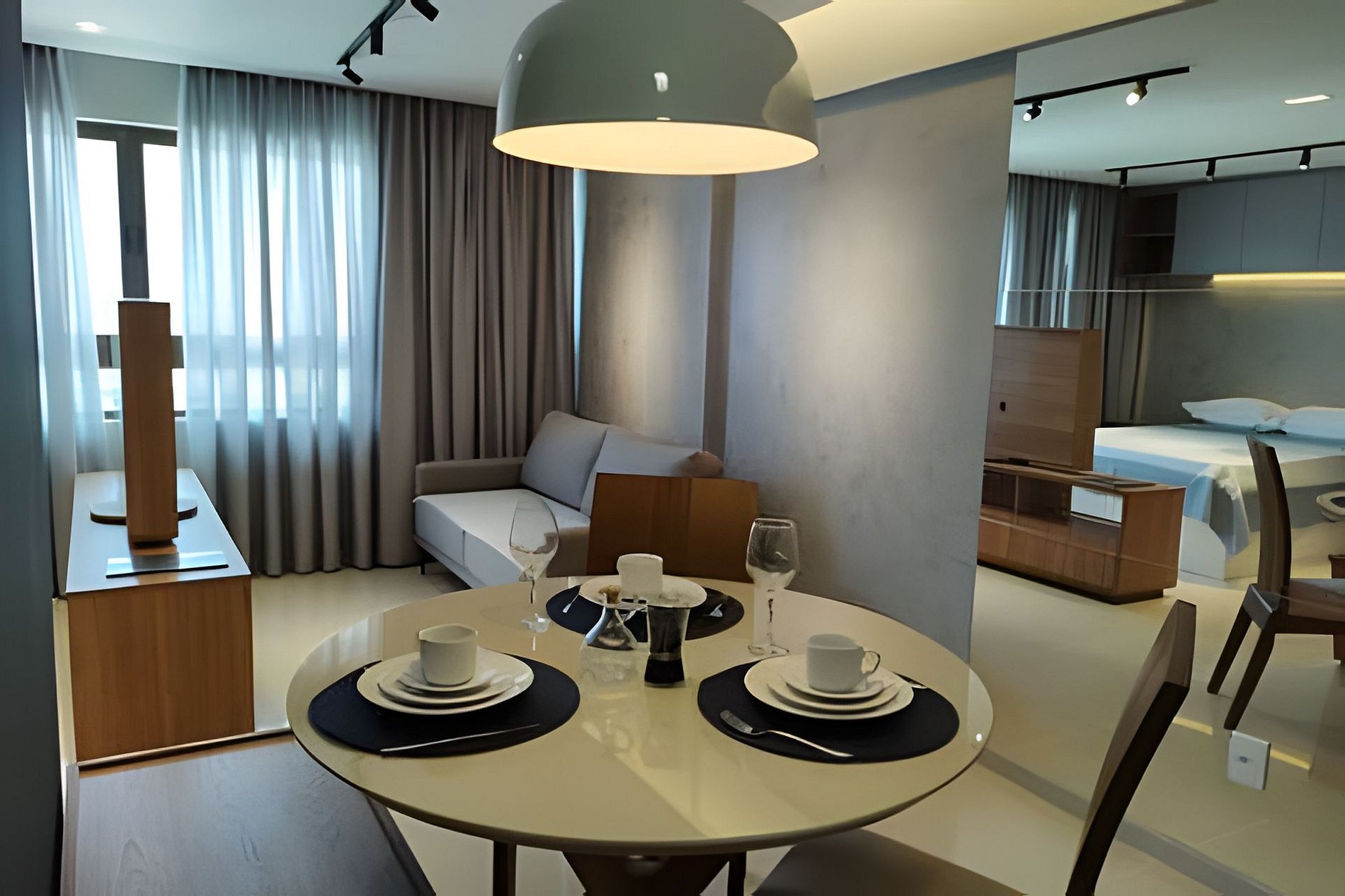 O apartamento é composto de sala e quarto open plan, banheiro e cozinha. Você também terá uma TV com painel giratório para dois ambientes. O prédio possui uma ótima piscina com vista para o mar, uma pequena academia e uma sala de reuniões.