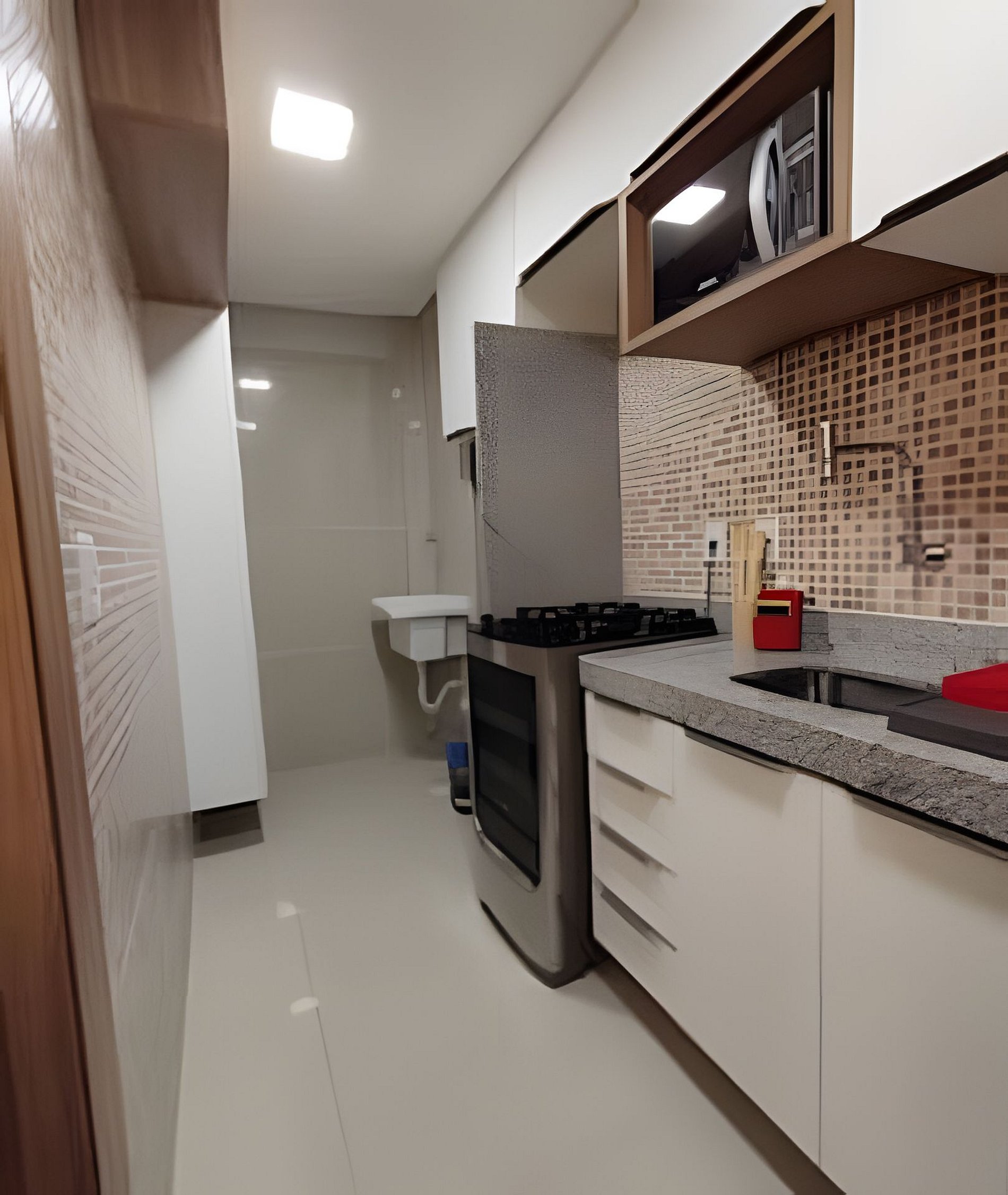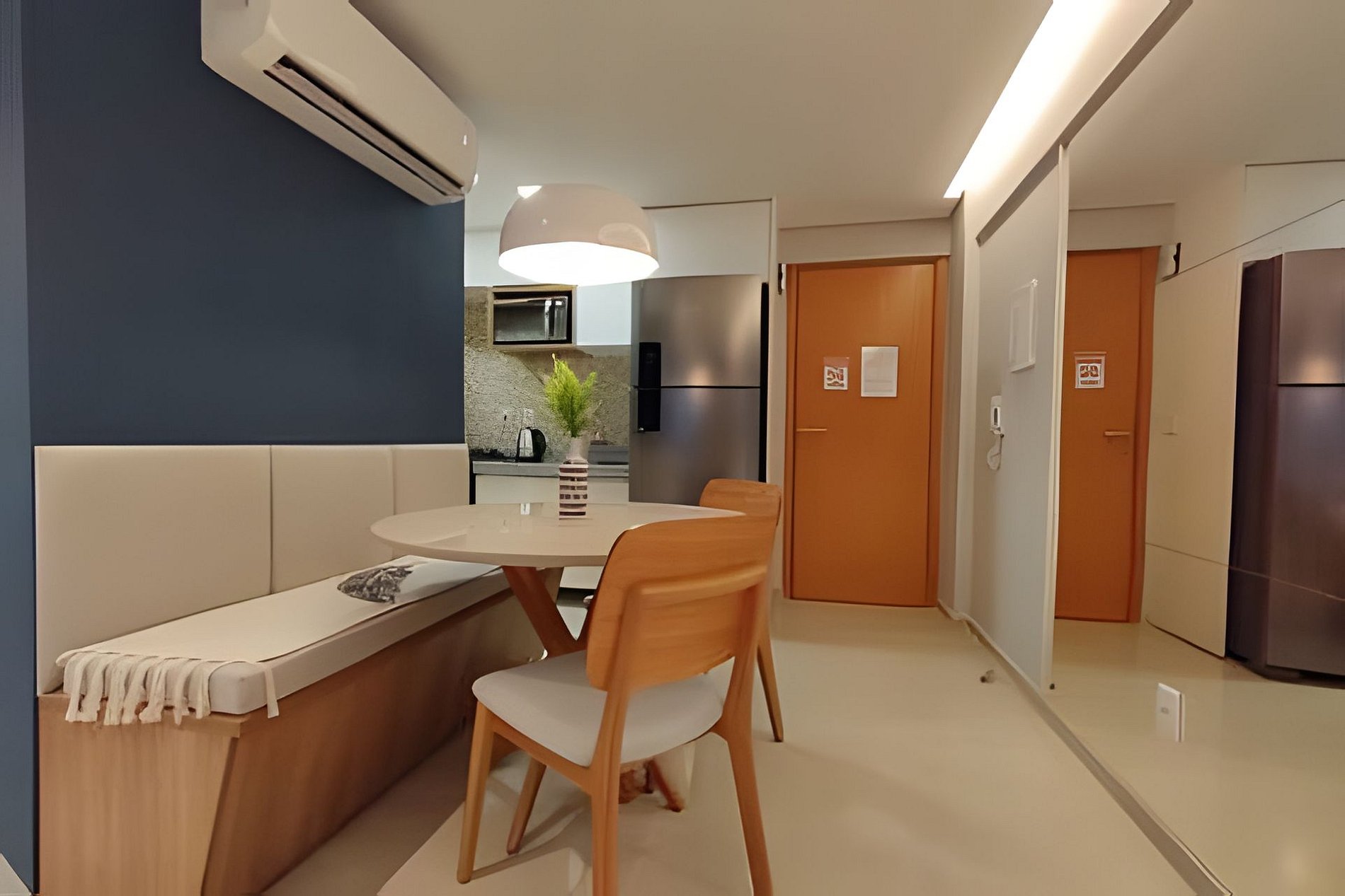 O apartamento é composto de sala, quarto open plan, banheiro e cozinha. TV com painel giratório para dois ambientes. O prédio possui uma ótima piscina com vista para o mar, uma pequena academia e uma sala de reuniões.